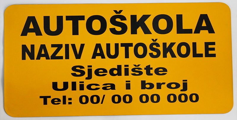Natpis mora biti žute boje s upisanim nazivom autoškole, sjedištem, adresom i brojem telefona.